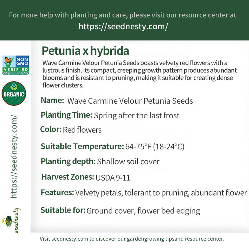 Wave Carmine Velour Petunia Seeds are unique in their velvety petals, rich red with a delicate sheen, and soft to the touch, offering both visual and tactile pleasure. Its creeping growth pattern and flexible, branching branches allow it to quickly cover the ground or container, forming a dense layer of flowers. The prolific blooms are impressive, with buds forming at nearly every branch node. This variety tolerates pruning well, and proper pruning after flowering can encourage secondary blooms and extend the blooming period. It is highly adaptable to various environments, tolerant of both drought and high temperatures. It grows best in full sunlight, resulting in vibrant flower colors. It is suitable for hanging pots on balconies, window sills, garden groundcovers, or as an edging plant. Whether planted alone or paired with other low-growing flowers, it creates a sophisticated landscape effect.