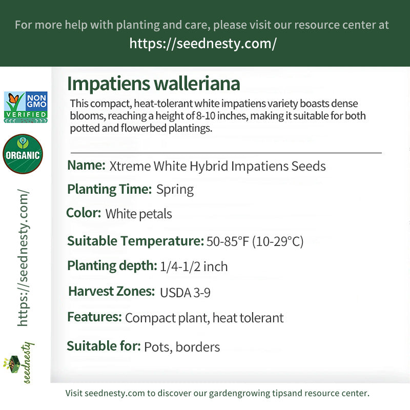 Xtreme White Hybrid Impatiens Seeds is a compact, heat-tolerant white impatiens variety. It thrives in high temperatures. Its dense, pure white blooms, reaching a height of 8-10 inches, create a fresh, bright effect in the garden. This variety is well-branched and resists leggy growth, blooming from mid-spring through summer. It's suitable for potted plants and borders.